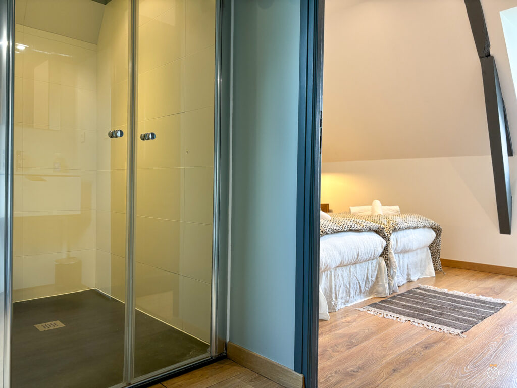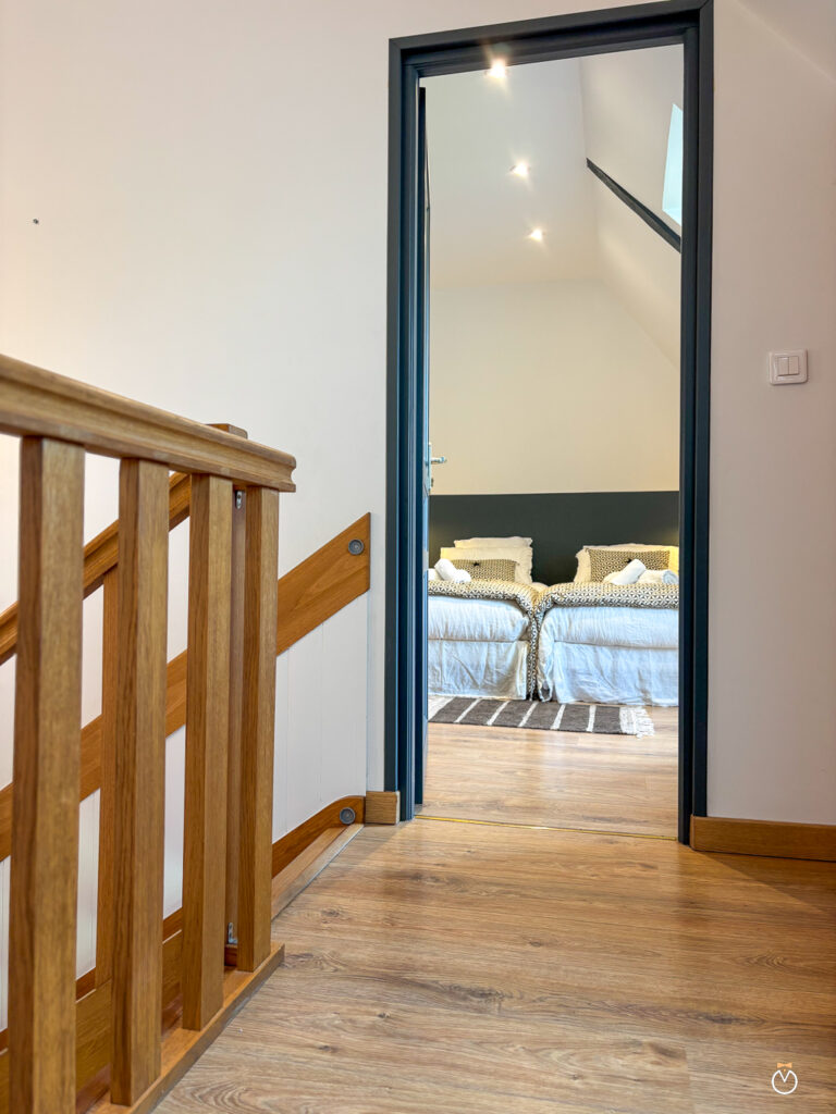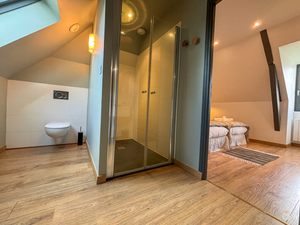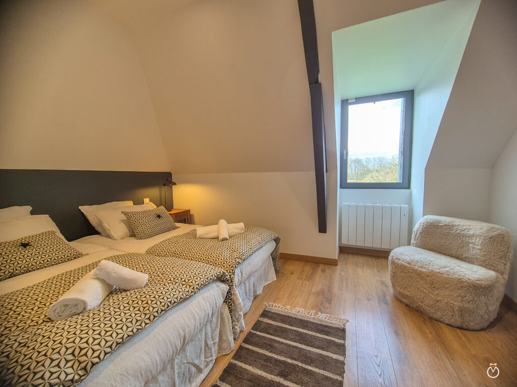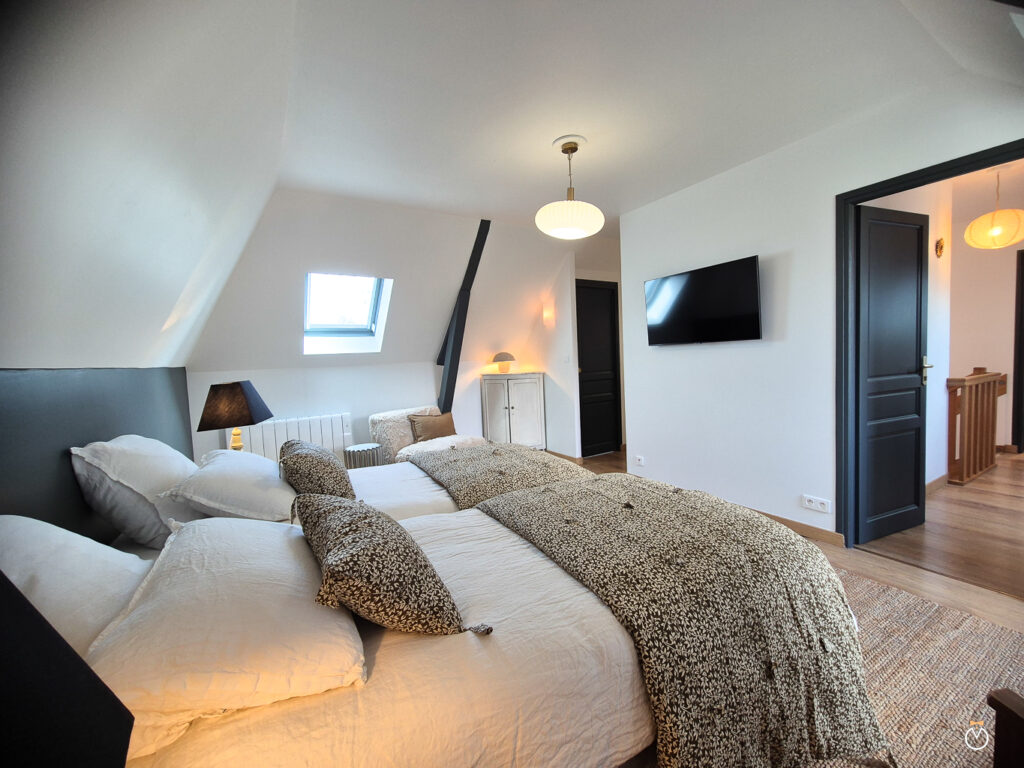 À l’étage, l’espace nuit se compose de deux chambres confortables, chacune disposant de sa propre salle de douche et de toilettes pour plus d’intimité. La première chambre est équipée de deux lits simples pouvant être rapprochés pour former un grand lit double, ainsi que d’une télévision. La seconde chambre offre également deux lits simples pouvant être réunis pour créer un grand lit double, et dispose elle aussi d’une télévision.