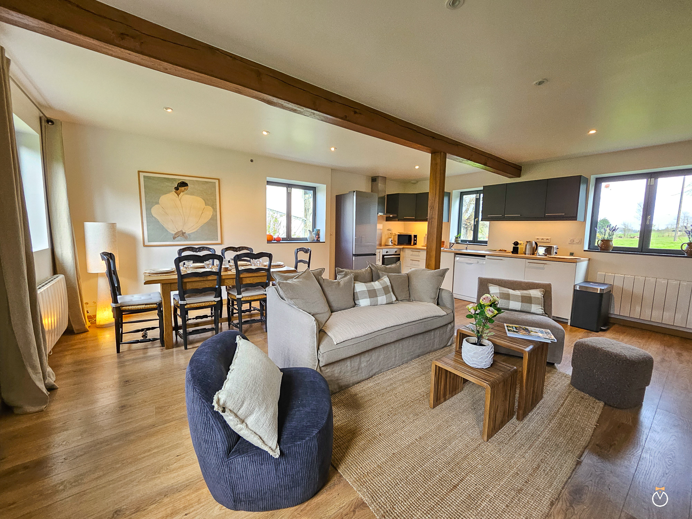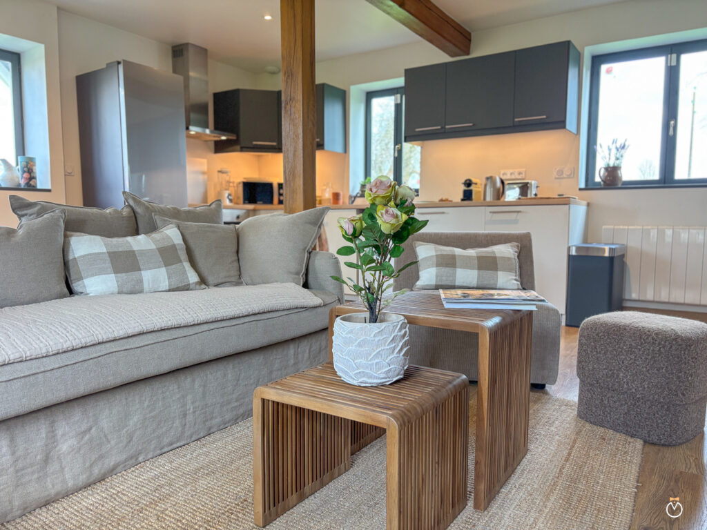 À l’extérieur, un jardin aménagé avec table, chaises et barbecue vous permettra de savourer pleinement vos repas en plein air et de profiter des beaux jours dans un cadre paisible. Pour un moment de détente, le bain nordique, accessible toute l’année, vous invite à vous relaxer tout en admirant la vue dégagée sur la campagne environnante. Les bébés sont les bienvenus ! Si vous avez besoin d’équipements supplémentaires, nous proposons la location des lits bébé et des chaises hautes, livrés et installés avant votre arrivée.