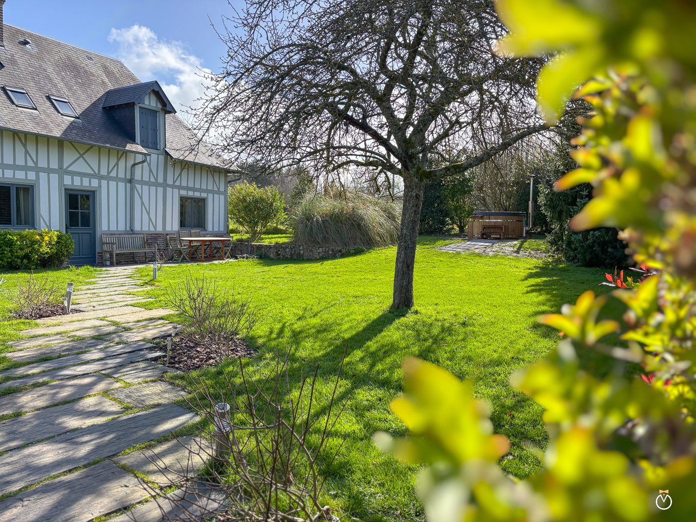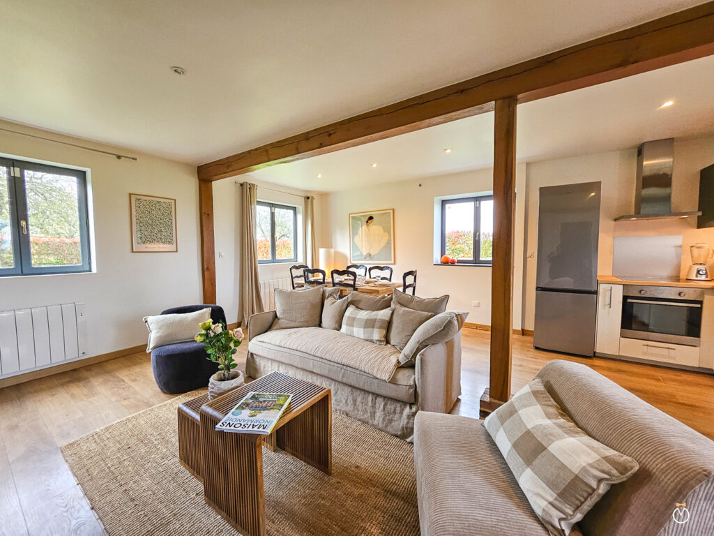 Le cottage Les Pommiers offre pour 6 personnes de belles prestations : une cheminée pour des soirées cosy, un bain nordique en plein air, un jardin fleuri ainsi qu’une terrasse ensoleillée.