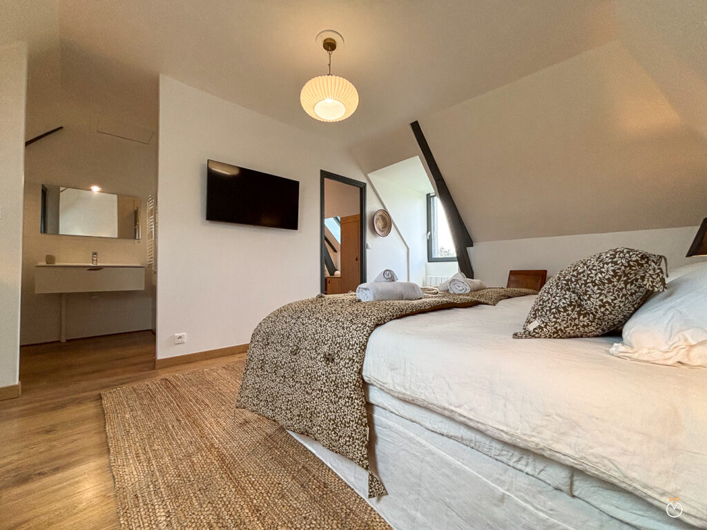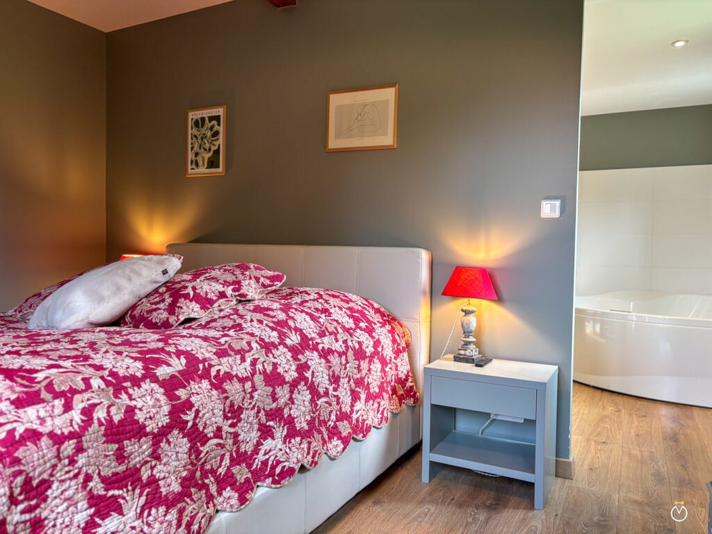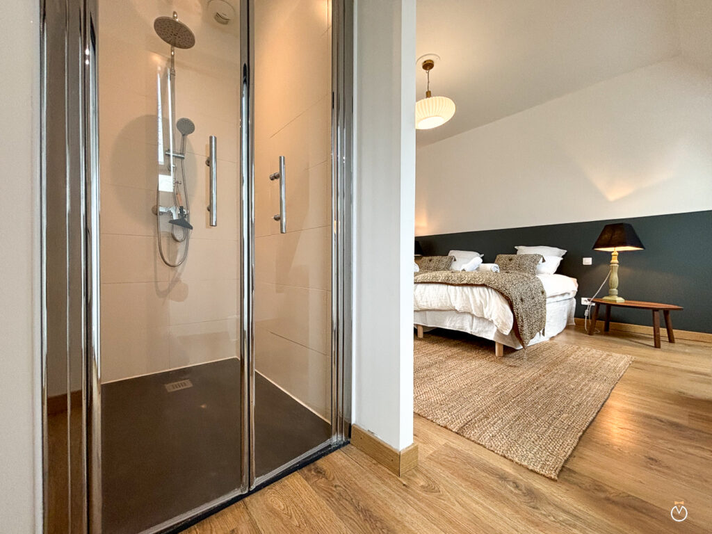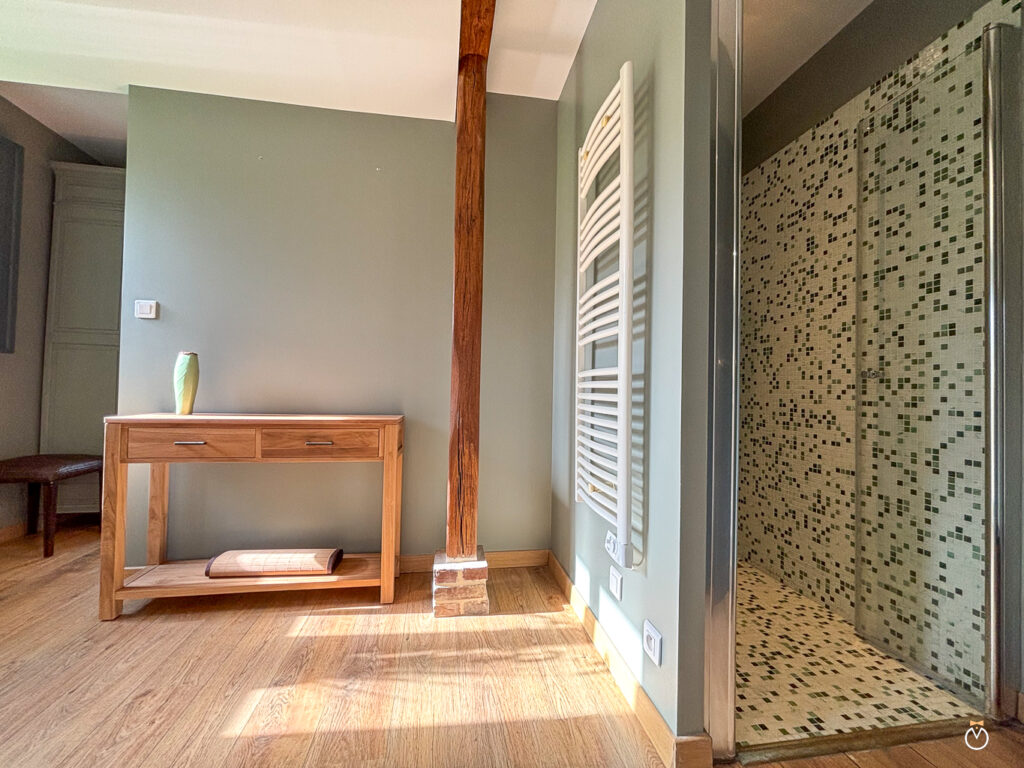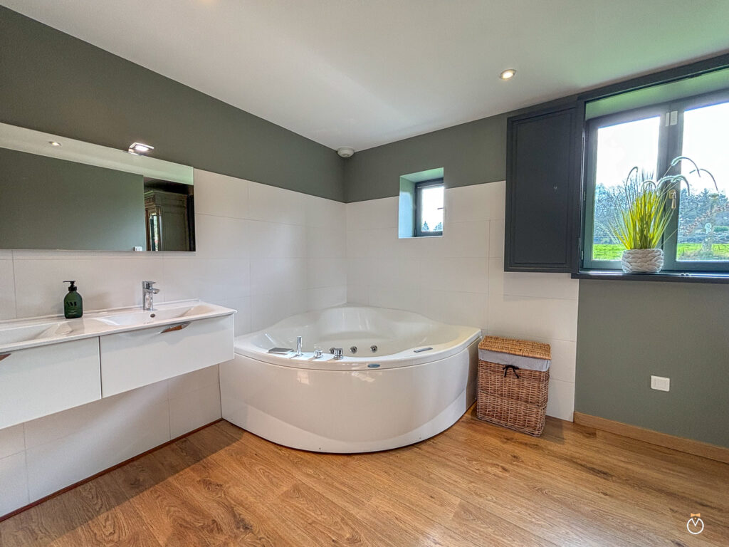 Au rez-de-chaussée, vous trouverez également une chambre parentale de charme avec un grand lit double et sa salle de bain privative. Celle-ci est équipée d’une baignoire balnéo, parfaite pour un moment de détente, ainsi que d’une douche à l’italienne et de toilettes.