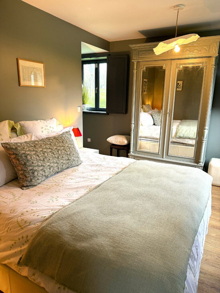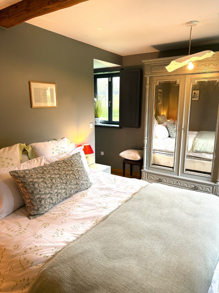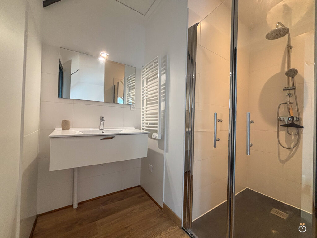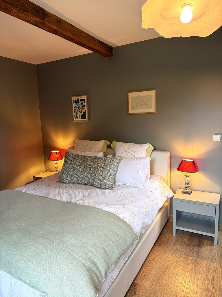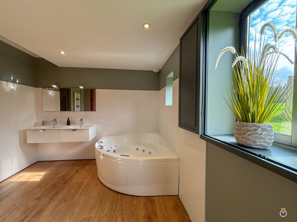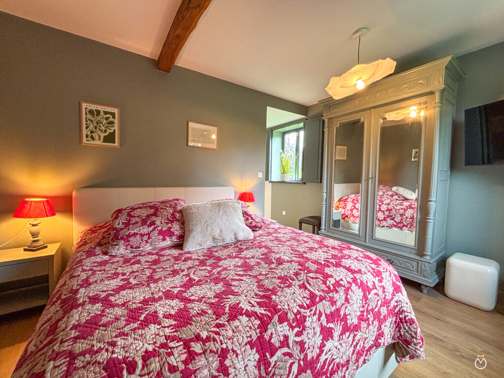 Au rez-de-chaussée, vous trouverez également une chambre parentale de charme avec un grand lit double et sa salle de bain privative. Celle-ci est équipée d’une baignoire balnéo, parfaite pour un moment de détente, ainsi que d’une douche à l’italienne et de toilettes.