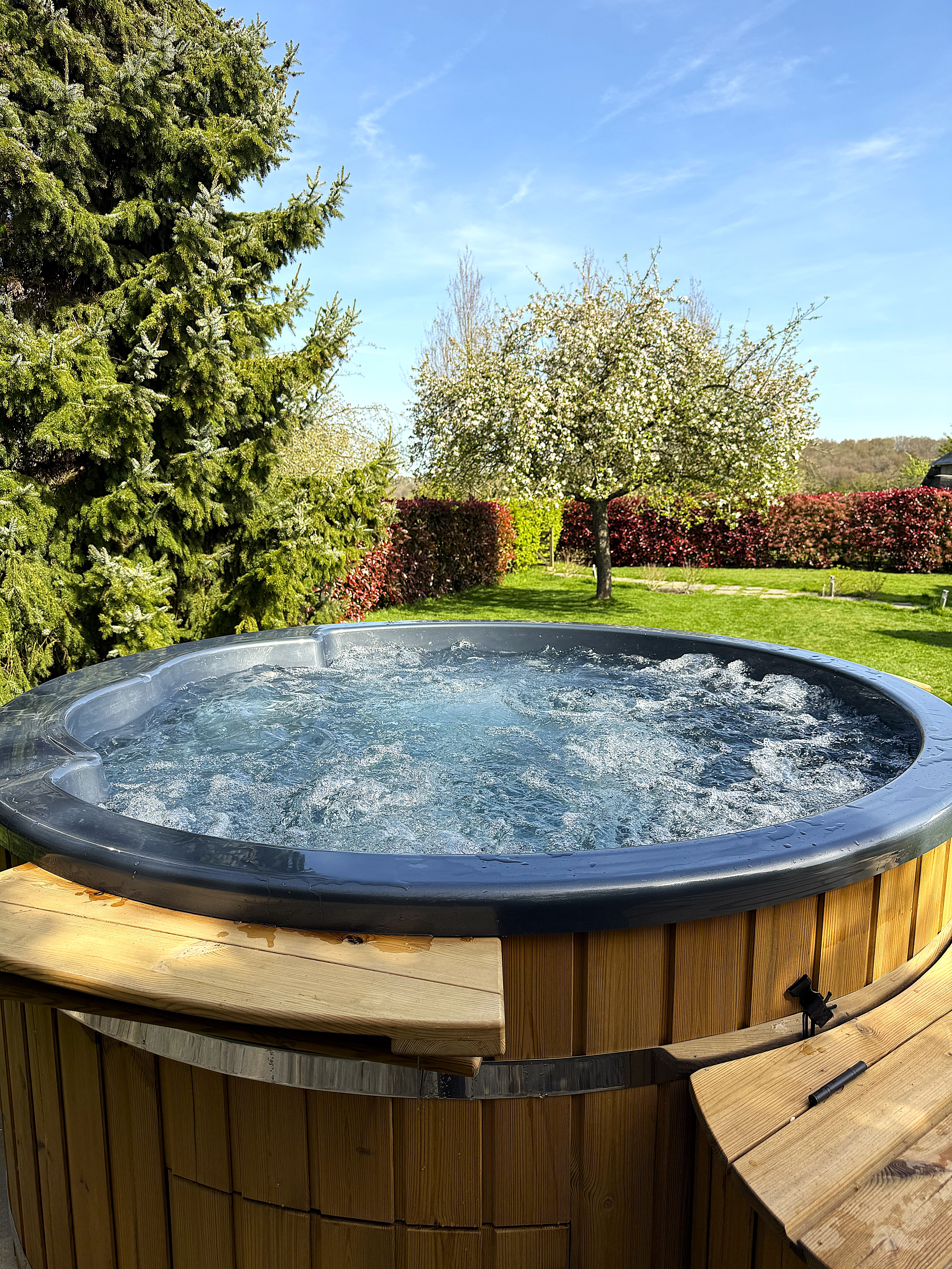 À l’extérieur, un jardin aménagé avec table, chaises et barbecue vous permettra de savourer pleinement vos repas en plein air et de profiter des beaux jours dans un cadre paisible. Pour un moment de détente, le bain nordique, accessible toute l’année, vous invite à vous relaxer tout en admirant la vue dégagée sur la campagne environnante. À noter que le bois d’allumage pour le bain nordique est fourni uniquement pour la première utilisation.