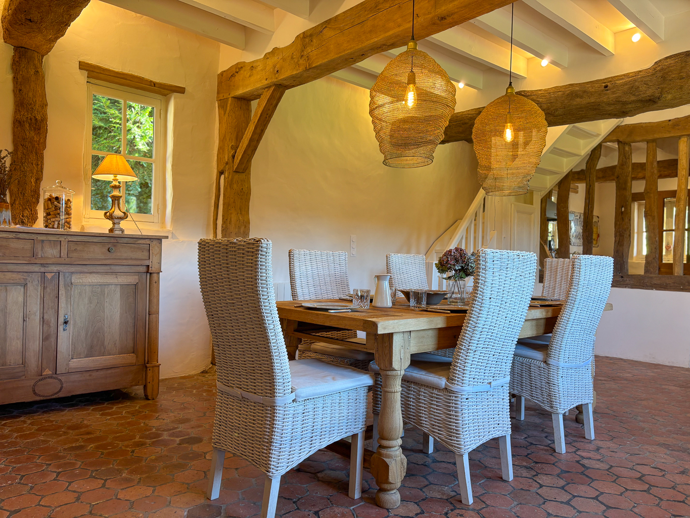 À l’extérieur, profitez de l’ample jardin et prenez vos repas sur la terrasse couverte. La cuisine d’extérieur avec barbecue vous permettra de partager des moments conviviaux. Pour les amateurs de pétanque, un terrain est à votre disposition, tandis que ceux qui préfèrent le farniente pourront se détendre au bord de la piscine chauffée à 27°C (ouverte de juin à septembre) tout en admirant la vue splendide sur la campagne normande.