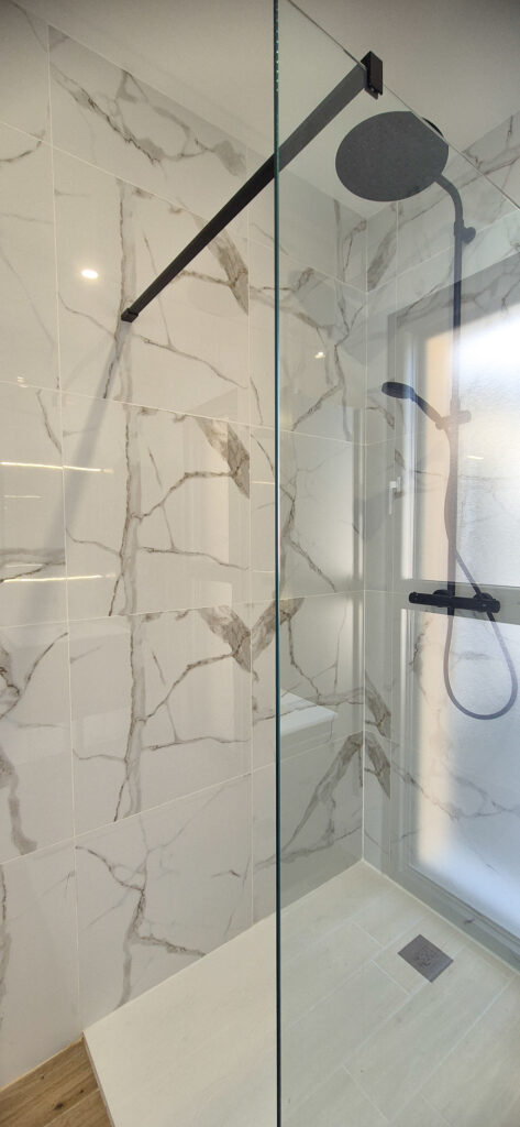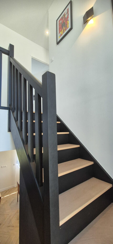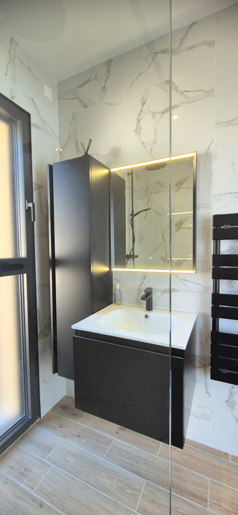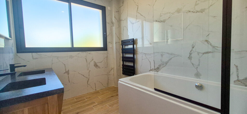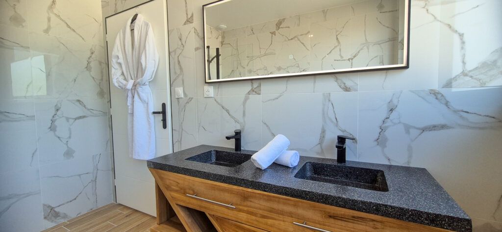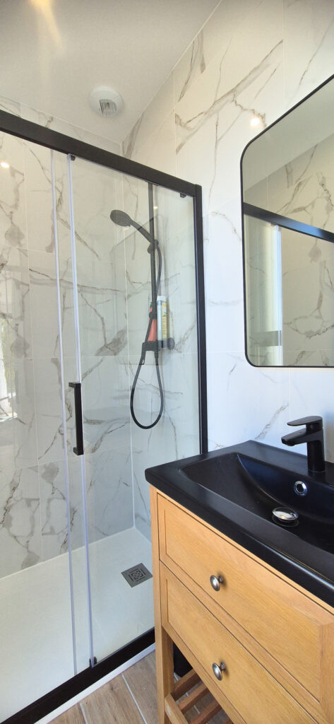 À l’étage, deux chambres avec lits simples ainsi qu’une chambre avec un lit double Queen Size vous attendent, une salle de douche et une salle de bain. Et un wc.